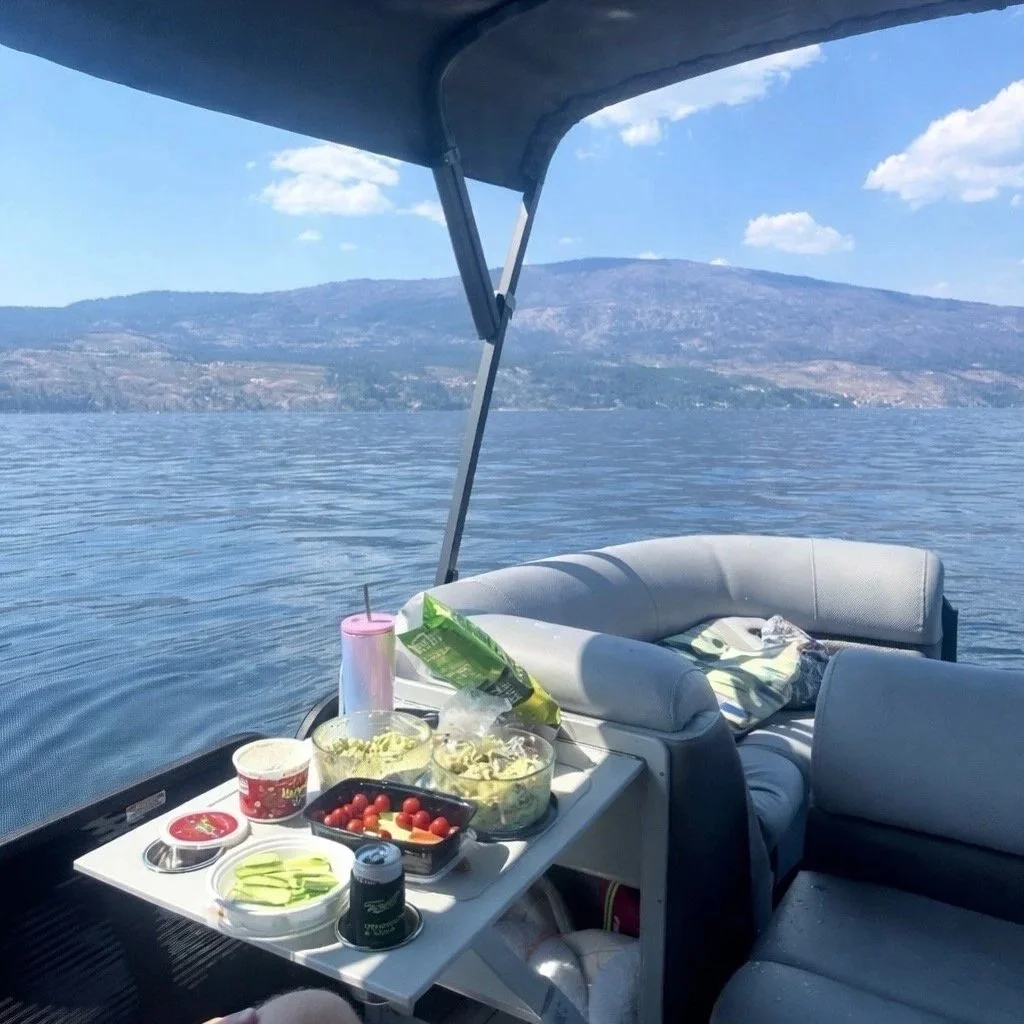 We typically cruise toward scenic Ellison park where guests can enjoy picnic tables, public washrooms, an the beautiful shoreline. There is also a fantastic lakeside restaurant 1516, which is easy to dock at for lunch or a snack. Onboard, you’ll find floaties, inflatable paddleboards, and tubes, perfect for lounging or enjoying some water fun. Whether you’re in the mood to relax or get active, we’ve go everything to make you lake day unforgettable.